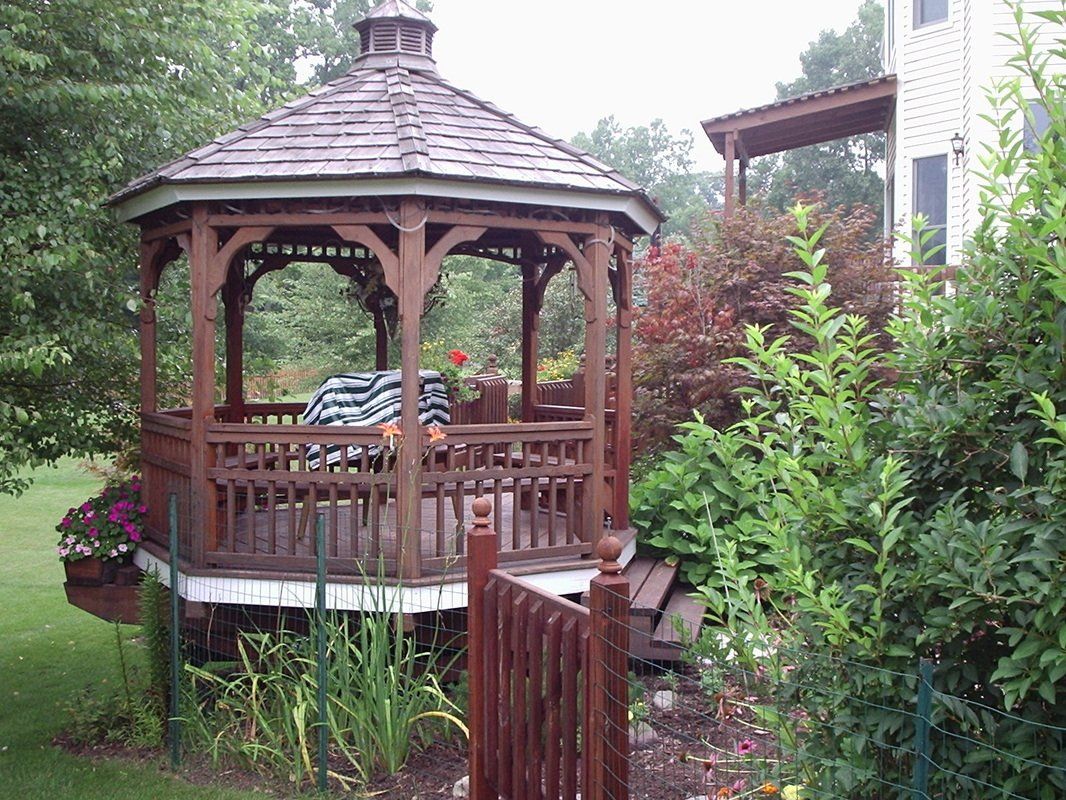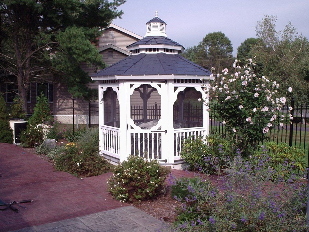 Many sizes are available in octagon, oval and rectangular styles. We offer vinyl or pressure treated lumber and options such as screens, benches, electric, vinyl-tec windows, pagoda roof, colonial rail and slate composite shingles. Our 100% maintenance free vinyl gazebos feature PVC railings, composite flooring and architectural asphalt shingles.